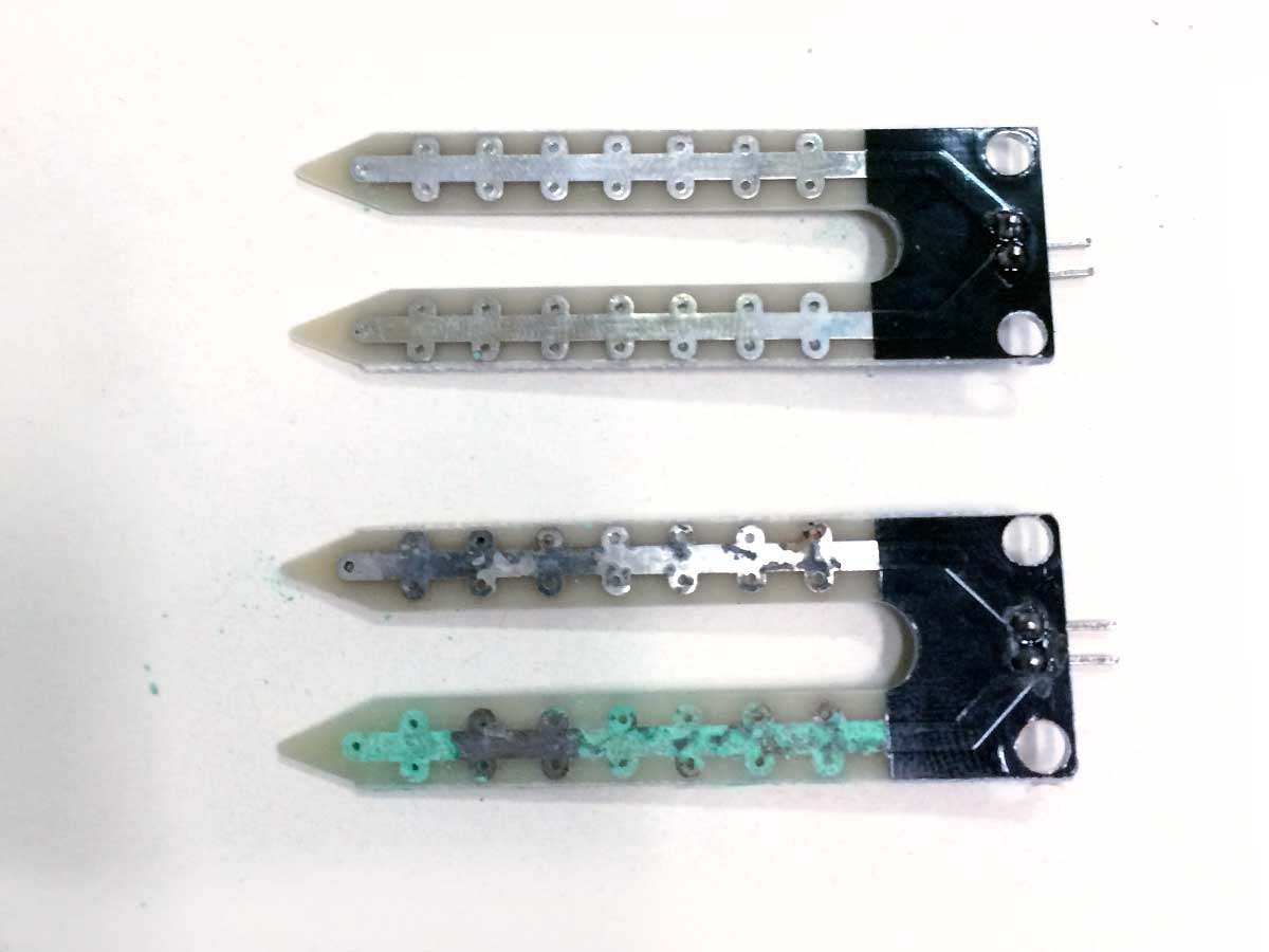 After 48 Hrs. the cheap sensor looks like this. The only data it measures is the level of corrosion. Much more useful is a capacitive sensor(i.e. from dfrobot)